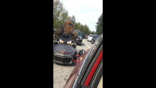A driver in Atlanta was stuck in traffic and noticed something strange behind him.  Chewbacca was also stuck. Now if Chewbacca were in the Millenium Falcon, perhaps he wouldn't have to wait like the other drivers.  He could just blast out of the space port and get to his destination quicker.